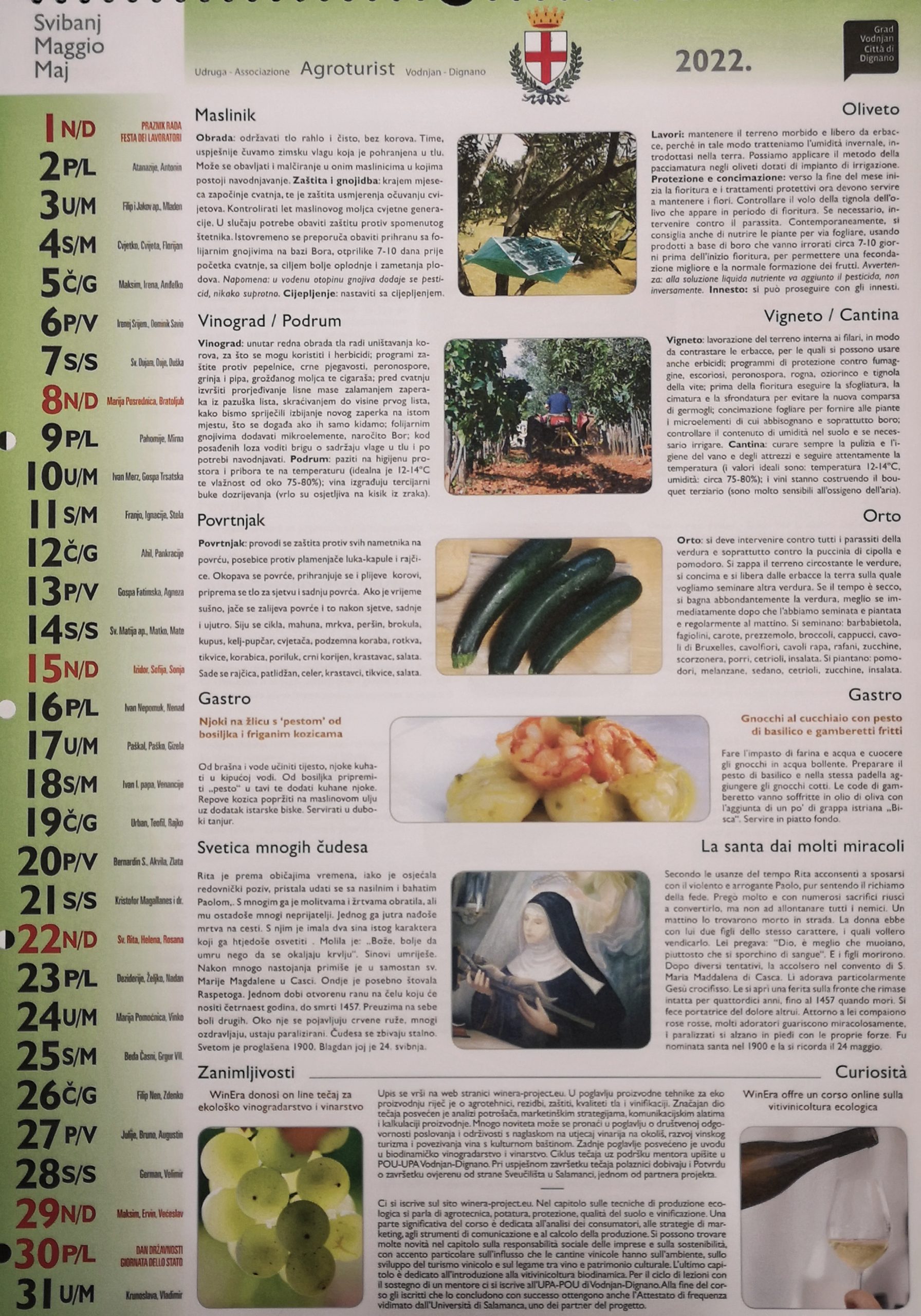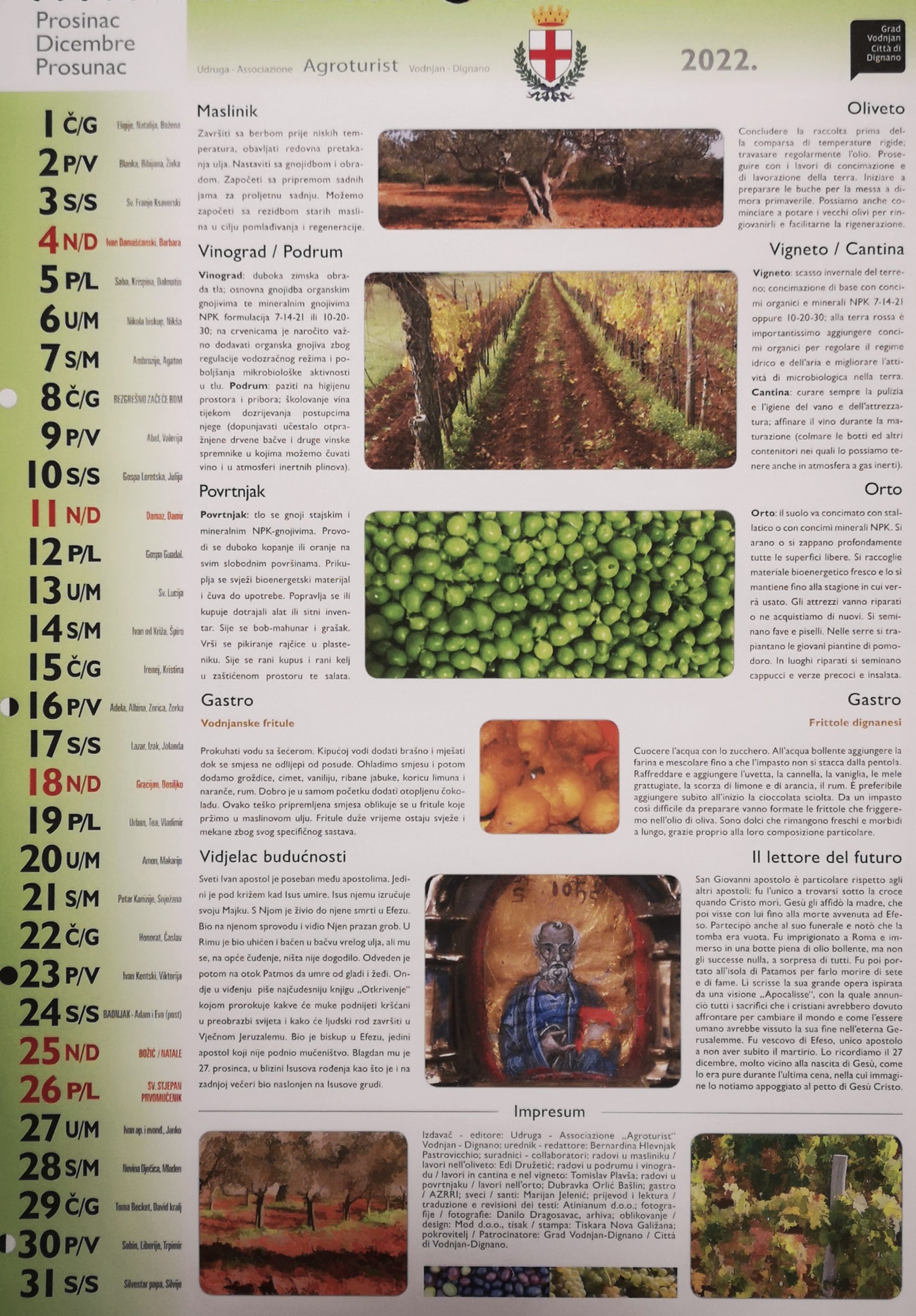 U kalendaru i godišnjaku poljoprivrednih radova za 2022. godinu obuhvaćene su informacije i upute vezane za poljoprivredne radove koje opisuju suradnici Edi Družetić (radovi u masliniku); Tomislav Plavša (radovi u vinogradu i podrumu); Dubravka Orlić Bašlin (radovi u povrtnjaku); AZRRI – Agencija za ruralni razvoj Istre (tradicionalni gastro recepti sa autohtonim namirnicama); vlč. Marijan Jelenić (informacije i pojedinosti o svecima); te zanimljivosti i manifestacije na području Grada Vodnjana-Dignano. Za prijevod i lekturu bila je zadužena tvrtka Atinianum d.o.o., a fotografije i design djelo su su autora Danila Dragosavca. Oblikovanje Kalendara potpisuje MOD d.o.o.