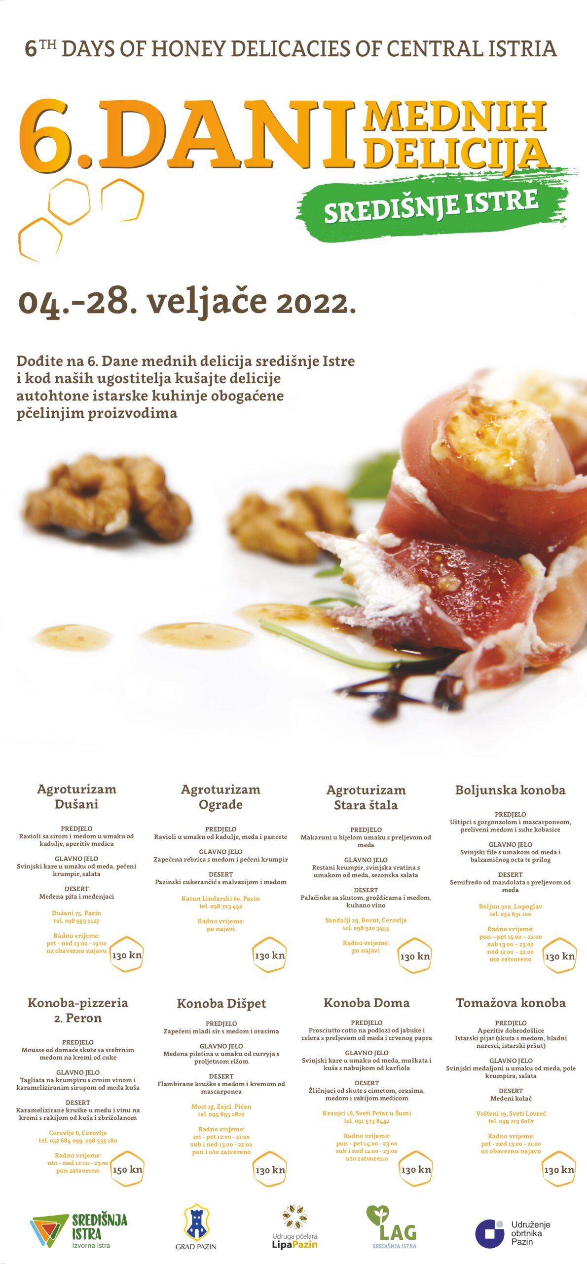 Aperitiv dobrodošlice – Istarski pijat (skuta s medom, hladni naresci, istarski pršut) – Svinjski medaljoni u umaku od meda, pole krumpira i salata – Medeni kolač | 130 kn